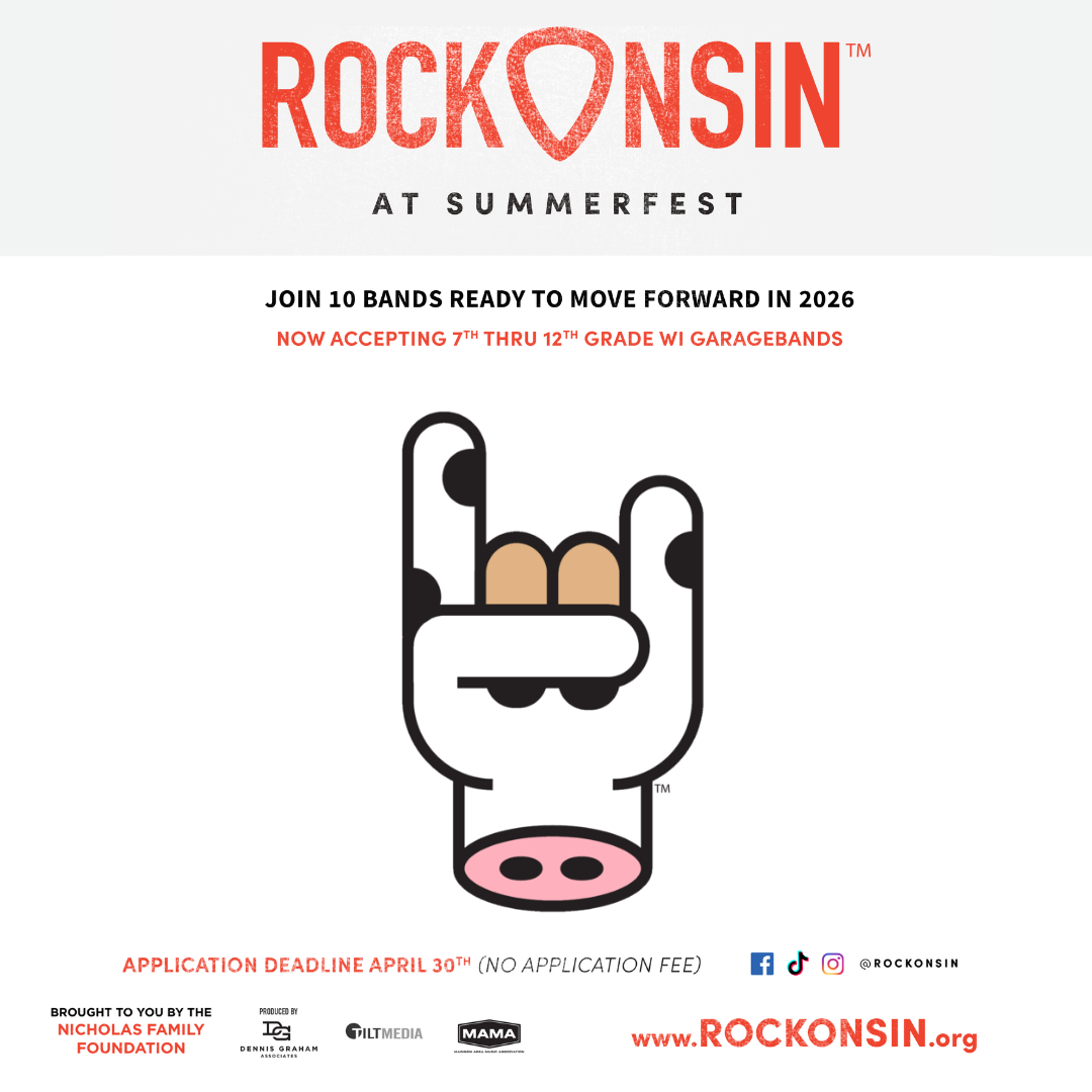 Ten 2026 ROCKONSIN State Finalist bands will compete & be showcased at Summerfest – The World’s Largest Music Festival. State Finals will be held on the Summerfest Aurora Pavilion Stage on Friday June 19 & Saturday June 20 from 12:15pm – 2:45pm each day.